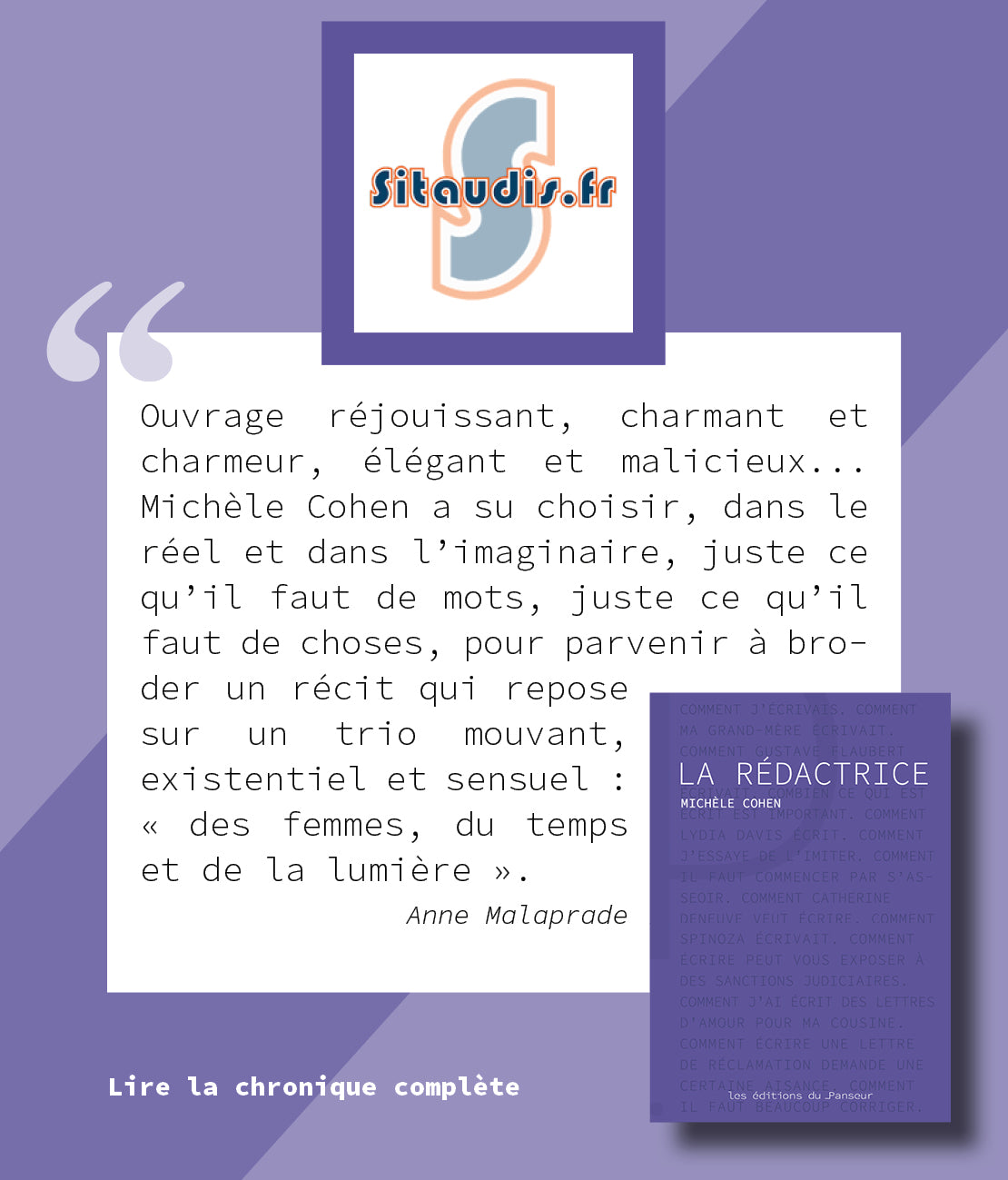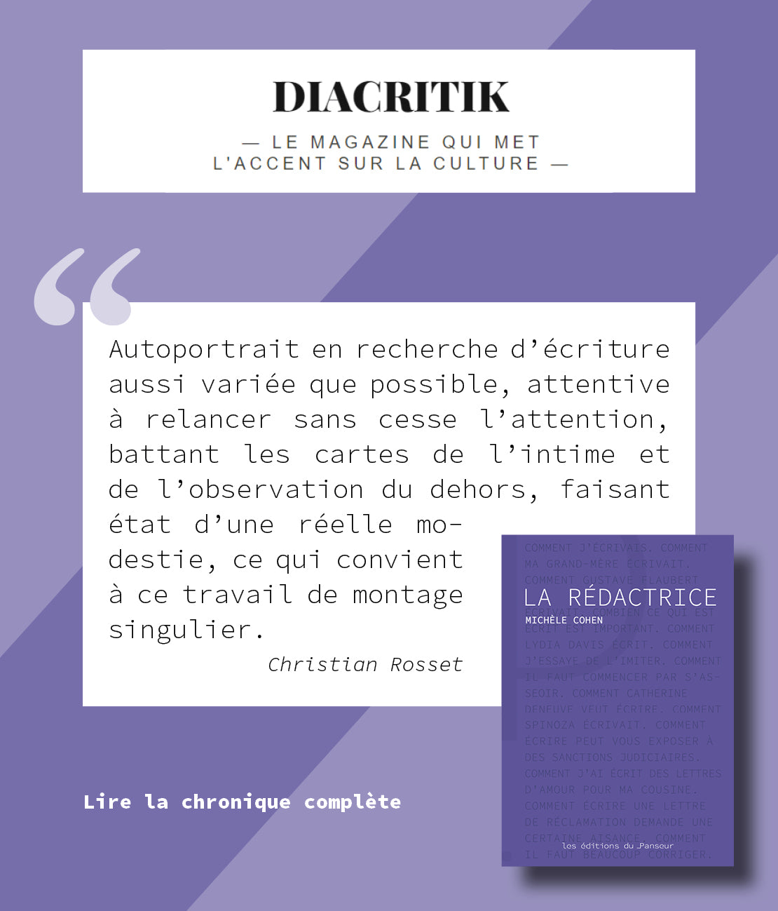 "Avec ce premier ouvrage de Michèle Cohen, l'éditeur ajoute à son catalogue un texte d'une rare qualité, ancré dans une expérience de la vie et une qualité d'attention à l'humain tout à fait remarquables."